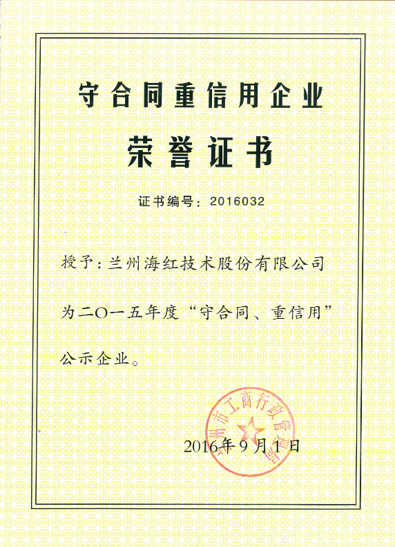 我公司榮獲2015年度“守合同、 重信用”企業榮譽稱號