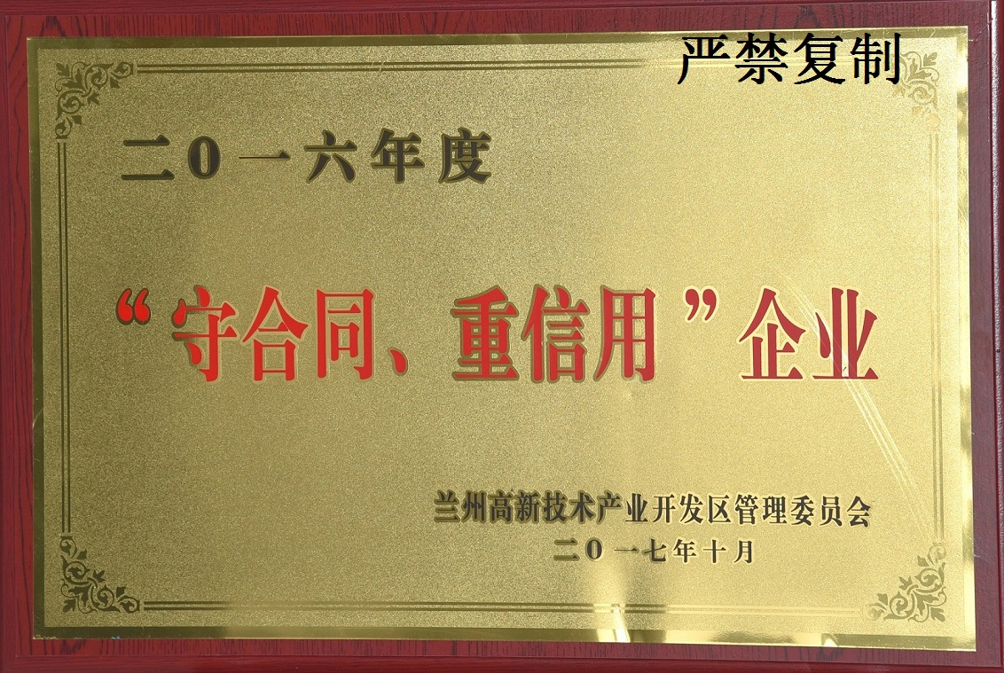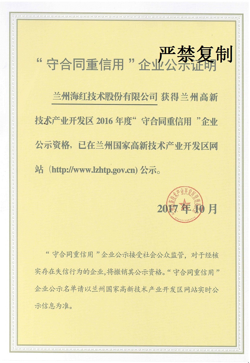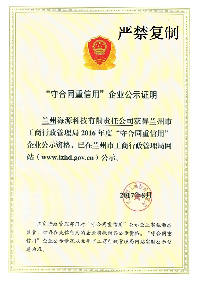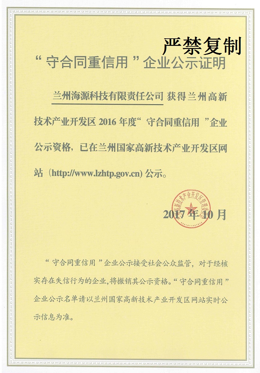 我公司及子公司(海源科技)被蘭州市高新技術(shù)產(chǎn)業(yè)開發(fā)區(qū)管理委員會評定為2016年度“守合同、重信用”企業(yè)。同時我公司被甘肅省工商行政管理局評定為2016年度“守合同、重信用”企業(yè),子公司(海源科技)被蘭州市工商行政管理局評定為2016年度“守合同、重信用”企業(yè)。