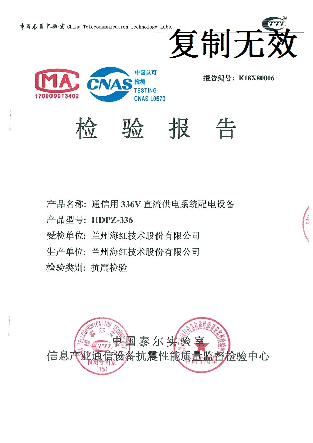 我公司“通信用336V直流供電系統配電設備”產品通過信息產業通信設備抗震性能質量監督檢驗中心的檢測,取得電信設備抗震性能檢測合格證。