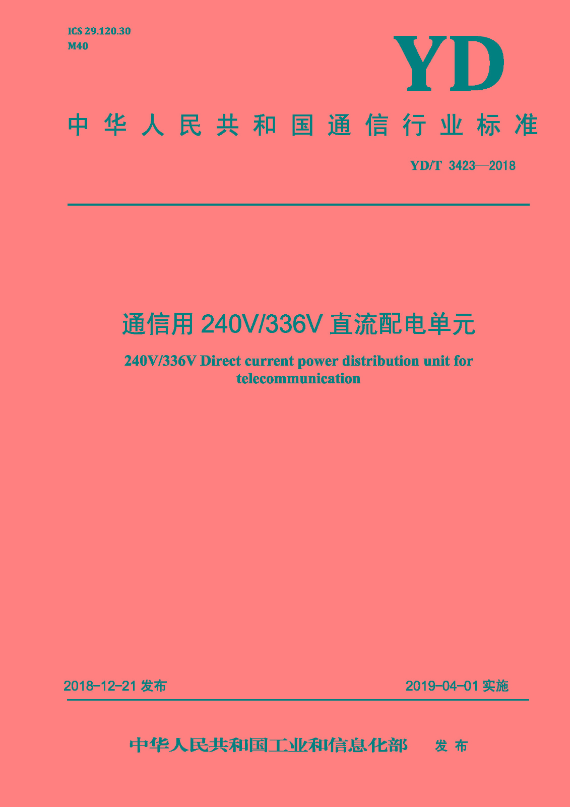 我司參與起草的《通信用240V/336V直流配電單元》(YD/T 3423-2018)行業標準經中華人民共和國工業和信息化部批準發布,已于2019年04月01日實施。我司技術中心研發部工程師何智暉參與了該標準的起草。該標準是繼《通信電源和機房環境節能技術指南第5部分:氣流組織》、《網絡機柜用分布式電源系統》、《通信電源和機房環境節能技術指南 第2部分:應用條件》、《通信用240V直流供電系統使用技術要求》、《通信局(站)電源系統總技術要求》五項標準之后,由我司參與起草正式出版的第6項行業標準。