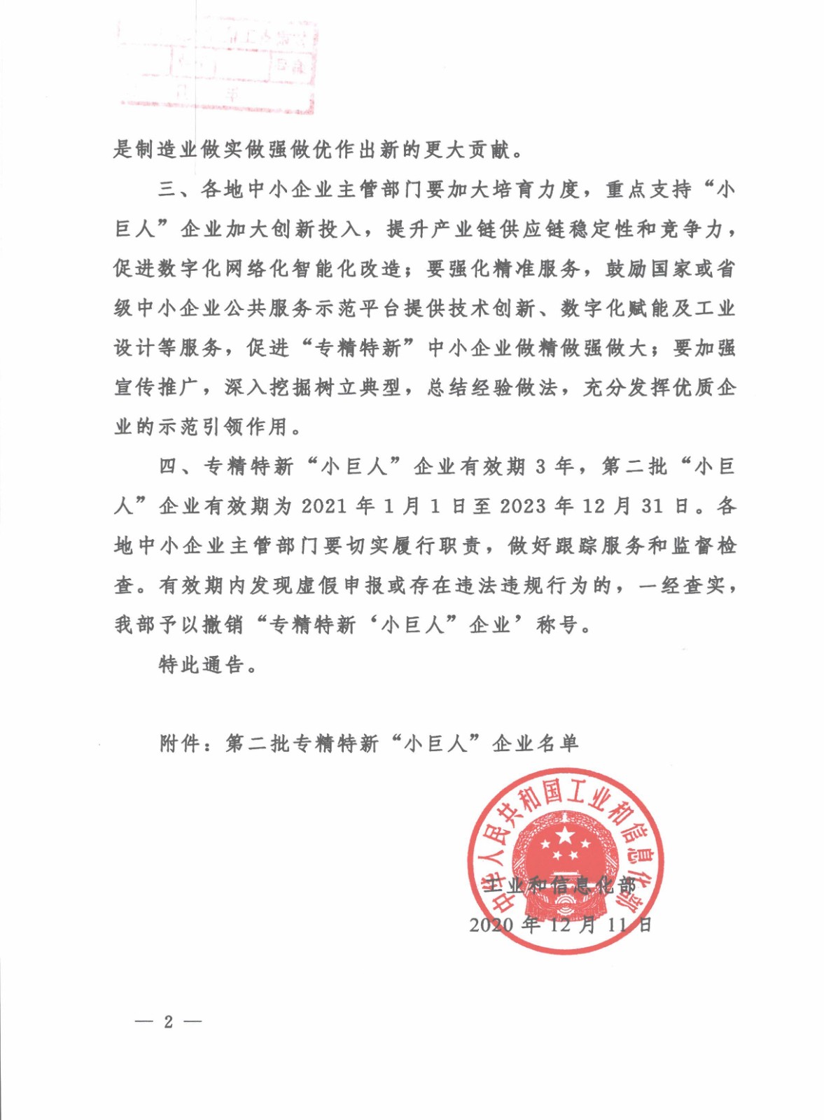 根據中華人民共和國工業和信息化部印發《工業和信息化部關于公布第二批專精特新“小巨人”企業名單的通告》(工信部企業函〔2020〕335號)文件,我司被工業和信息化部授予“專精特新‘小巨人’企業”稱號。
