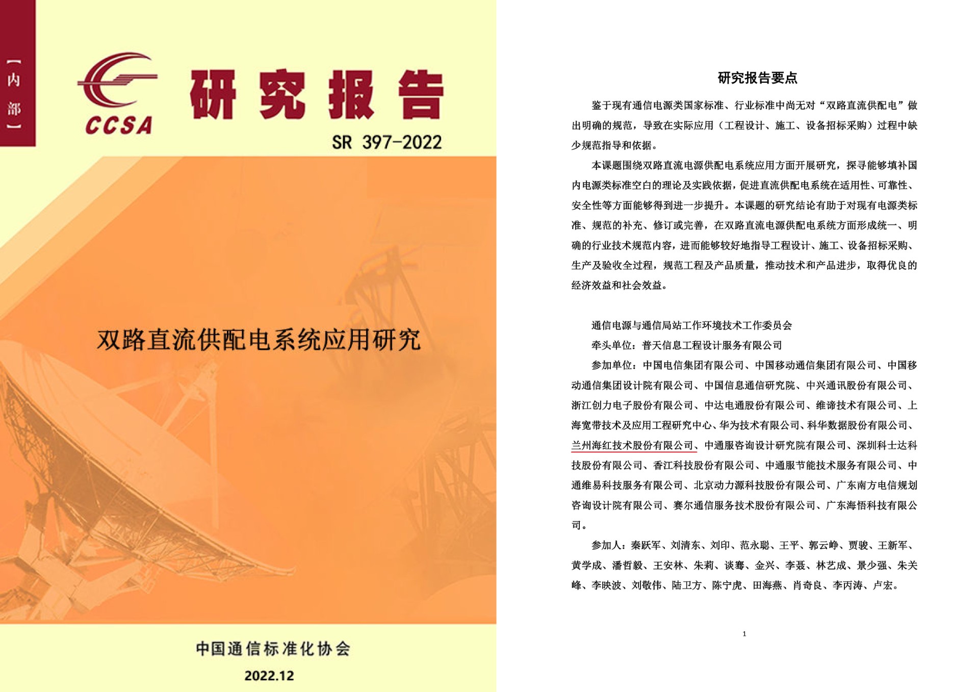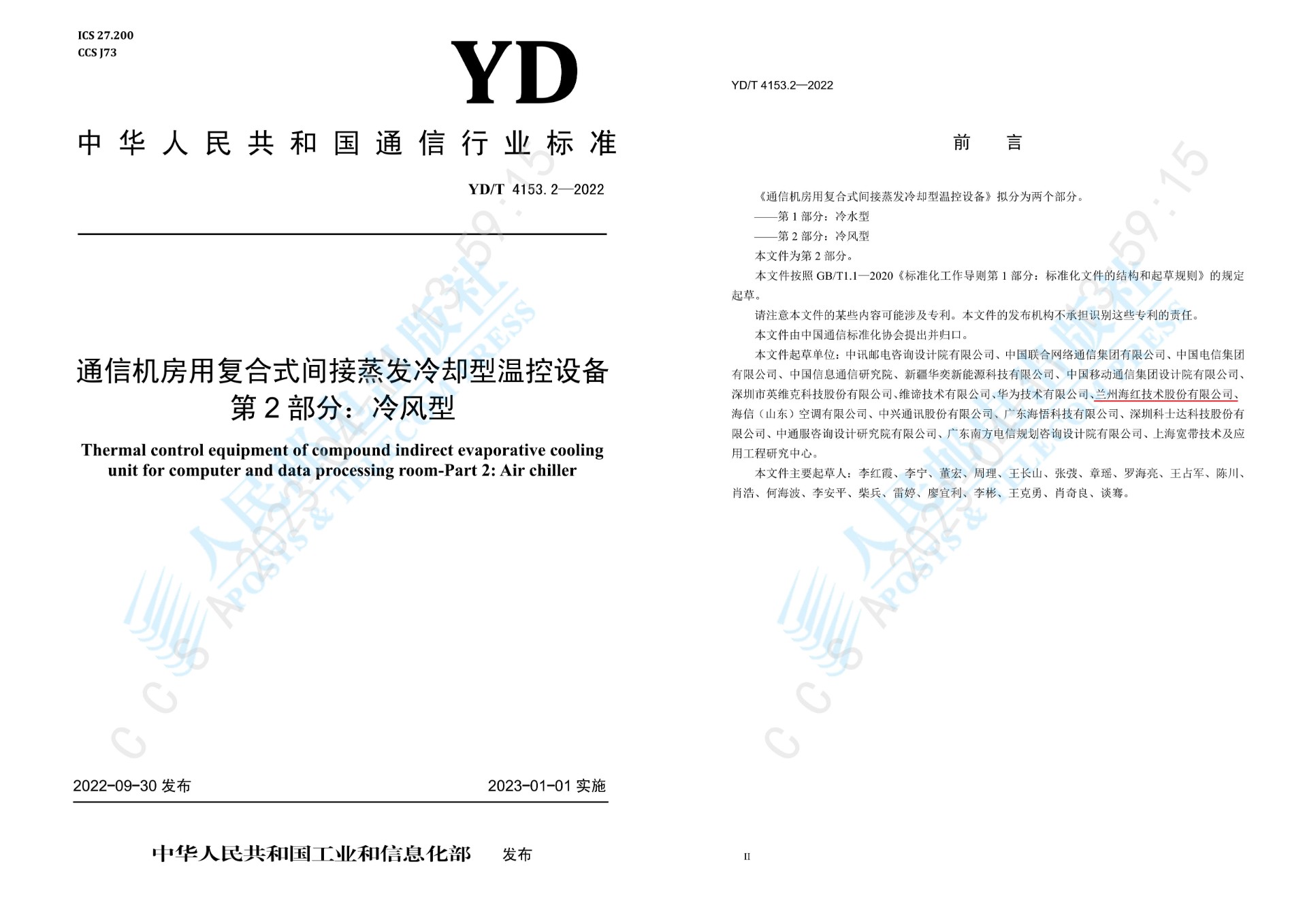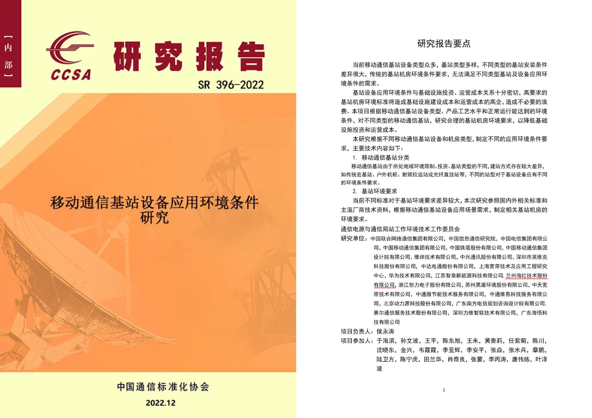 我司參與起草的兩項行業標準《通信機房用復合式間接蒸發冷卻型溫控設備 第1部分:冷水型》(YD/T 4153.1-2022)及《通信機房用復合式間接蒸發冷卻型溫控設備 第2部分:冷風型》(YD/T 4153.1-2022)經中華人民共和國工業和信息化部批準發布,已于2023年01月01日實施。同時,我司參與的兩項研究課題也于近日出版了研究報告,分別為《雙路直流供配電系統應用研究》及《移動通信基站設備應用環境條件研究》。 至此我司共參與起草、修訂行業標準19項、研究課題2項,詳細情況如下: