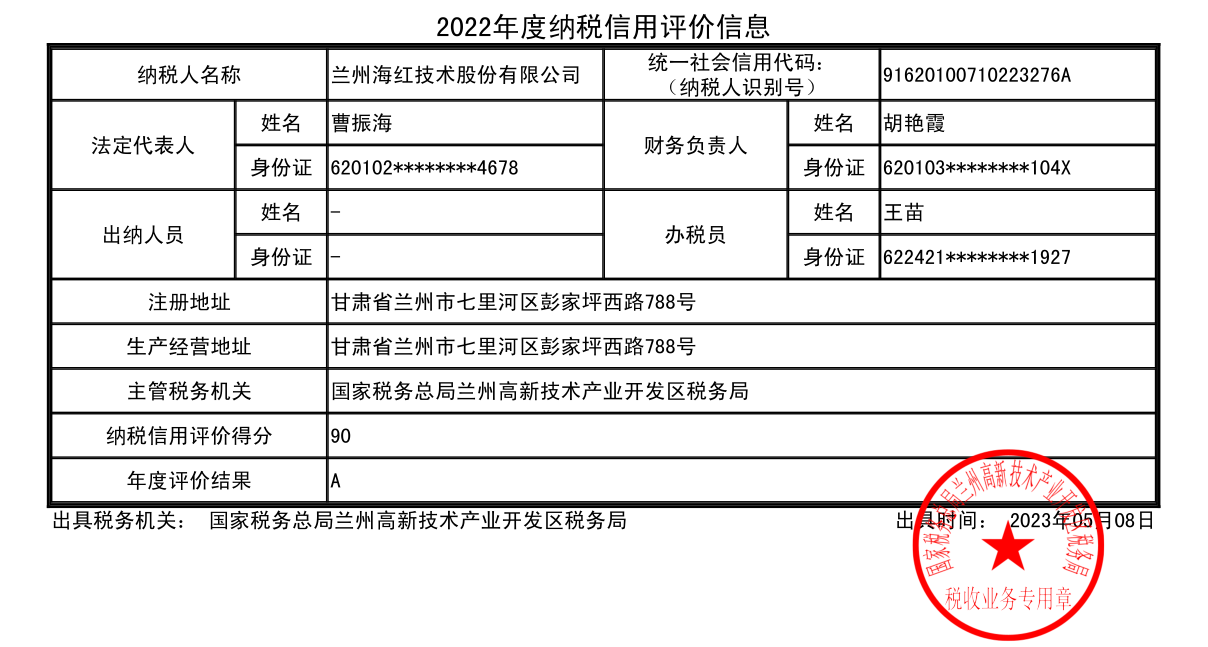 我司被國家稅務總局甘肅省稅務局評價為“2022年度納稅信用A級納稅人”。至此,我司已連續九年被評價為“納稅信用A級納稅人”,這是稅務機關對公司堅持誠信經營、依法納稅的充分肯定,有助于公司在銀行信貸、經營投標等方面維護良好的信譽和形象,有利于促進公司可持續發展。