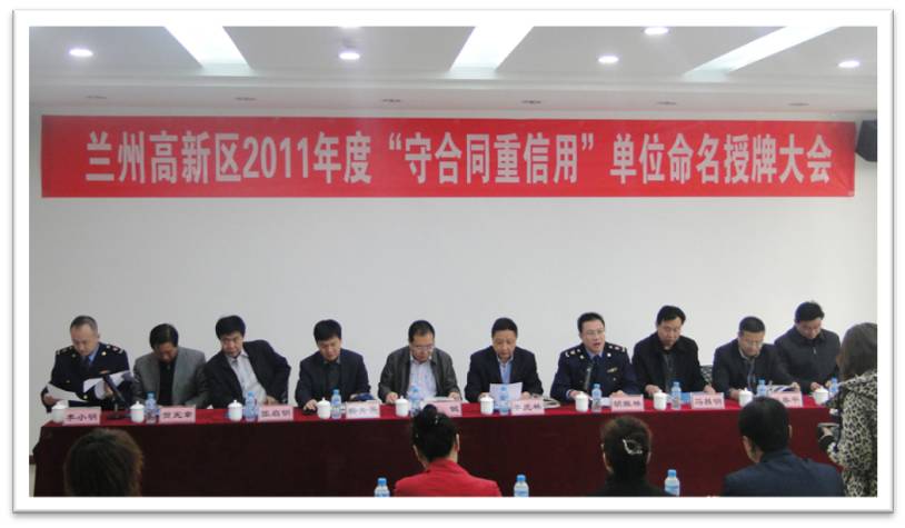 會議當天,蘭州高新區主要領導對所有“守合同、重信用”企業進行授牌。我公司行政人資中心總經理焦旭麗作為3家企業代表之一,在現場做了守重工作匯報及交流。高新區管委會主任李虎林在會議上強調,企業信用建設是一項長期的工作,任重道遠,要堅持以科學發展觀為指導,踏實工作,開拓創新,切實加強企業信用體系建設,為把蘭州高新區建成促進全市經濟社會率先跨越發展的重要戰略支點做出新的貢獻。